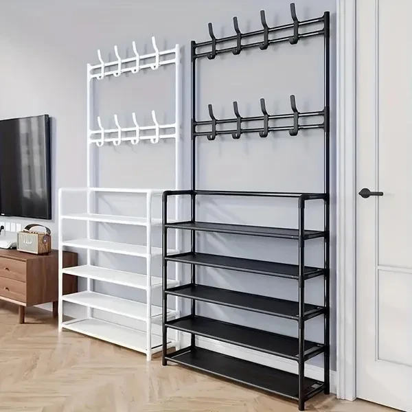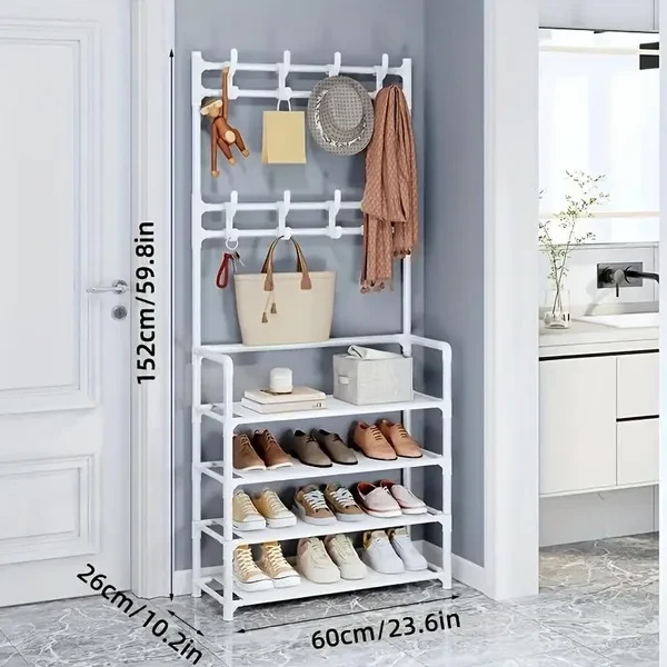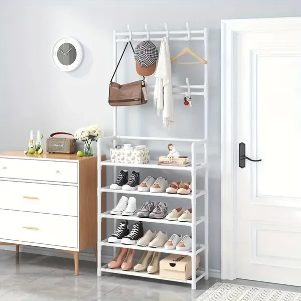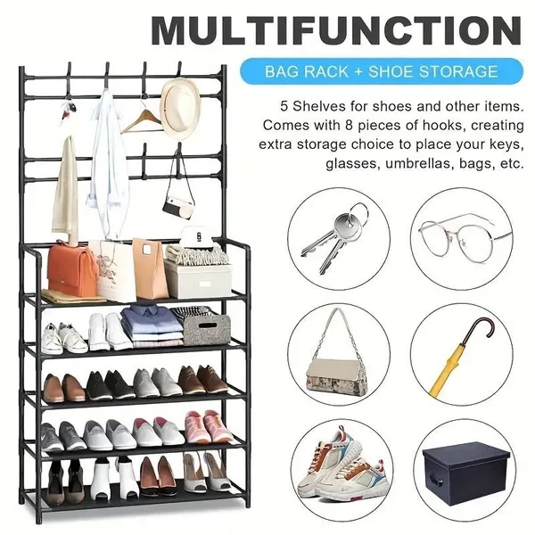 About the product ★ High-quality clothes rack: high-quality iron is the main material of clothes rack. Its surface is coated with an environmentally friendly coating to prevent the hanger from rusting. The bottom of the hanger is a small shoe rack that can be used to put shoes or shoe boxes, which not only gives you more storage space, but also makes the hanger more stable. ★ Save space: Open locker is the perfect combination of shoe rack, coat rack and hat rack, saving space. A total of 5 shelves, there is enough storage space to meet a variety of local needs and accessories, so that your life in order. ★ Simple structure: The coat rack with shoe rack is easy to disassemble and assemble, and it is a simple part that can be assembled in a few minutes. Thanks to the hall tree's simple structure and detailed instructions, the assembly is done before you know it. ★ Multi-functional hat rack: The hat rack is equipped with 8 hat hooks and 5 layers of shoe rack, the hat rack helps you keep the entrance clean, make your clothes and items orderly, easy to use, meet the needs of your clothes, large capacity, space saving, simple and convenient, convenient daily hanging. ★ Wide range of application: the hanger is suitable for placing behind the porch and door. Easy to store shoes, clothes, hats, bags, towels, umbrellas, etc. Perfect for your family bedroom, guest room, children's room, living room, and also perfect for your office. Hangers keep your clothes and accessories neat and have greater strength and stability.