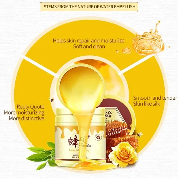 100% new high quality feature: Contains a variety of plant extracts. Helps the skin replenish the necessary moisture. Propolis moisturizing and nourishing ingredients. Makes the skin smooth, moisturized, non-greasy, giving the skin a caring treatment. specification: Product Name: Natural Milk Honey Hand Wax Film Shape Exfoliating Propolis Hand Cream Hand Wax Net: 170 grams Occasion: Hand Care Quantity: 1