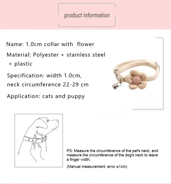 Item: Cute flower pet collar Size: 1.0*30cm, adjust 22.-29cm Season: Autumn/ Winter Color: As the pictures show Package: 1 piece collar including Warm tips: *Due to the different monitor and light effect, the actual color of the item might be slightly different from the color which is showed on the pictures. *The unit is cm, the actual size is measured. Due to the different measurement methods, there will be 2-3CM aftercare. The actual size is subject to the actual product. New Cute Flower Pet Cat Cat Collar Traction Cute Cartoon Flower Bell Collar Cat Necklace Small Dog Dog Supplies