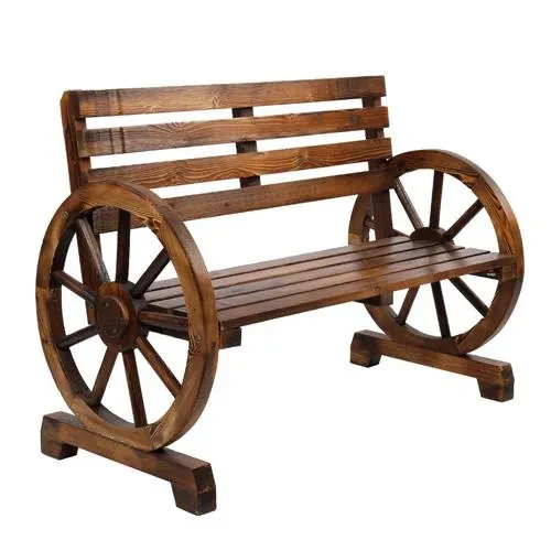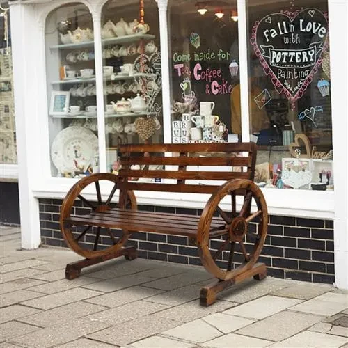 Features: 1. Rustic style completes your patio or garden area 2. Two armrests feature unique wagon wheel design 3. Crafted from solid fir wood with a dark brown finish, sturdy and durable 4. A large slatted back and seat for best comfort 5. Wide seat can hold up to 2 people Specifications: 1. Material: Fir Wood 2. Color: Brown 3. Overall Dimensions: (41.1 x 21.1 x 30.9)" / (104.5 x 53.5 x 78.5)cm (L x W x H) 4. Seat Dimensions: (37.8 x 14.2 x 14.6)" / (96 x 36 x 37)cm (L x W x H) 5. Weight: 24 lbs / 10.9 kg Package Includes: 1 x Bench 1 x Hardware Set 1 x Manual Introductions: Complete your patio or garden area complete with this Rustic 2-Person Wooden Wagon Wheel Bench! The two armrests feature unique wagon wheel design, creating an eye-catching outdoor spot anywhere it stands. Crafted from solid fir wood with a dark brown finish, it is sturdy and durable enough to last for years. A large slatted back and seat make this bench a comfortable place to rest on. Wide seat allows for 2 people to sit and relax. It will surely become a staple in your garden.