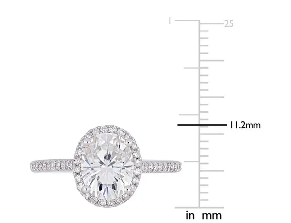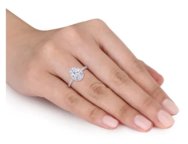 2.00 Carat (ctw) Synthetic Moissanite Halo Engagement Ring 14K White Gold with 1/5 Carat (ctw I1-I2) Diamonds 1 This unique and sophisticated synthetic moissanite engagement ring is crafted in 14 karat white gold and features an oval-cut, prong-set created moissanite at its center in a double halo of 46 round-cut, buttercup-set radiant diamonds with shimmer along the shank. With exquisite luster and incredible shine, choose this style for your bride-to-be as you celebrate this special milestone and begin the next stage of your lives together. Moisannite is the perfect replacement for a diamond and comparable to or even surpassing the clarity, and color of a diamond. Beautifully crafted in 14k white gold with a Polished Finish Stone Type: Moissanite; Color: White; 2.00 CTW; Quantity: 1; Brilliant Cut; Oval Shape; Dimensions: 9x7 mm; Lab Created; 4-Prong Setting Stone Type: Diamond; Color: H-I; Clarity: I1-I2; 0.23 CTW; Quantity: 46; Brilliant Cut; Round Shape; Natural; Prong Setting This item ships in signature jewelry box packaging, ready for gift-giving with a classic, elegant look and feel This Diamond Engagement Ring is the perfect gift for any bridal engagement, birthday, anniversary, holidays, thank you, thinking of you, or for any reason at all SKU: 08DLG1004035MOIW-P