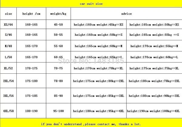 The item we sell are in Asian size, usually 1-2 size smaller than Euro size !!! The item we sell are in Asian size, usually 1-2 size smaller than Euro size !!! The item we sell are in Asian size, usually 1-2 size smaller than Euro size !!! Features: 1. Automatic kart set with 2 layers. 2. The quality is good 3. The fabric is polyester 4.Special parts made of stretch fabric (shoulder, waist, sleeve). 5. Hidden and YKK zipper with two pull-ups, personalized design. 6. Sleeves and foot openings designed with ribbed fabrics help prevent unnecessary movement of the garment. 7. Adjustable collar 8.Comfortable and breathable. 9. Red, black, blue, white & black 10. Exquisite embroidery logo, exquisite workmanship. 11. Fast delivery time Superior quality [Size] XS, S, M, L, XL, XXL, 3XL, 4XL [Number of layers of cloth] two layers Light twill fabric (windproof and rainproof) [Lining] fine sports cloth (breathable and quick drying) [Gross weight] 1.5kg ~2KG