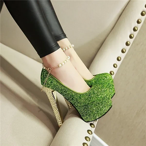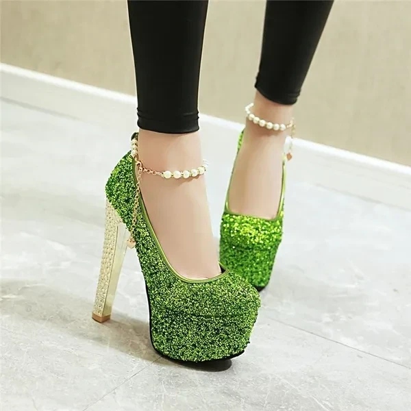 Pump Type : Ankle Strap Heel Height : Super High (8cm-up) Heel Type : Thin Heels Upper Material : Sequined Cloth Toe Shape : Round Toe Occasion : Party Closure Type : Buckle Strap Outsole Material : Rubber Insole Material : PU Season : Summer Style : Sexy is_handmade : Yes With Platforms : Yes Platform Height : 5-7cm Lining Material : PU Fit : Fits true to size, take your normal size Fashion Element : Bling Gender : Women Item Type : Pumps heel : 15cm platform : 5.5cm