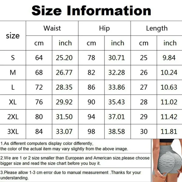 Fabric/Material: Polyester Care Instructions: Hand Wash Size:XS-XL Color:As the iamges Package:1*Women's Yoga Shorts 【Butt Lifting】- The butt lifting leggings for women with high waist design can play the role of anti cellulite and cover the abdomen well. Skin-friendly wrapping is more comfortable, and the back has a V-cut hip line design, three-dimensional shape, no shifting, highlight your buttocks perfectly! 【Features】- Breathable,soft,stretchy,hygroscopic,squat proof,strong compression, seamless, tight fit, quick drying.It provides lightweight and comfort along with sweat absorption and moisture wicking capabilities. 【Textured Fabric】- The textured booty leggings has a comfortable and super elastic fabric, which can hold your waist and extend to the ankle nicely. 【Occasions】- Designed to help you stretch with ease - Chafe-free and ergonomic seams for a natural range of motion. Perfect for yoga, gym, pilates studio, exercise, weightlifting, running, any type of workout 【WARM TIPS】- Size note: Our size is different from wish. Please kindly refer to the size chart showed in the image or contact with us.