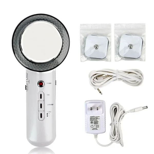 Function: EMS + Infrared + Ultrasonic Features: Effective ultrasonic facial and body beautifying beauty massager. EMS skin and body slimming and tonning machine.Skin rejuvenation infrared heat therapy device. Enhance skin texture, anti-wrinkle, helps fight fatty areas, tightens. Quickly and effectively reduce and give relief from severe chronic back pains, other sort of body aches. Regulate internal secretion and accelerate consuming of fat, realize the dreams of body slimming. Mini and stylish appearance, convenient to carry, easy to use. For both facial & body use. Specification: 1. Far infrared has following functions: The carbon fiber bundle surrounding the probe can generate far infrared ray with the wavelength ranging 8 -12μm. It can penetrate into deep skin, boost vigor of skin, activate cells and accelerate metabolism. 2. Ultrasonic have three main functions: It can change the capacity and movement of every cell with precise massage function which is named as cells massage. It can stimulate and adjust the cytomembrane, increase the permeability of epidermis, its thermal, physical and chemical effects can rise the temperature in deep skin by 0.5-1°C, promote skin to absorb essences, accelerate metabolism and reinforce the regenerative course of tissue. Ultrasonic can also decompose waste surrounding fat, consume energy, repair lymph and capillary vessels with weight losing and figure sculpting functions. 3. Micro current: Massage with micro current, stimulate the muscles with passive movement under current. Muscular movement consumes fat, sugar and carbohydrate of surrounding tissue. Under normal movement, muscle may consume 60-70 joule energy per second, but under high frequency movement, muscle can consume 3000-4000 joule energy per second. Package included: 1x 1MHz Ultrasound massager 1x Power adapter 1x Wire 4x Pads 1x English manual