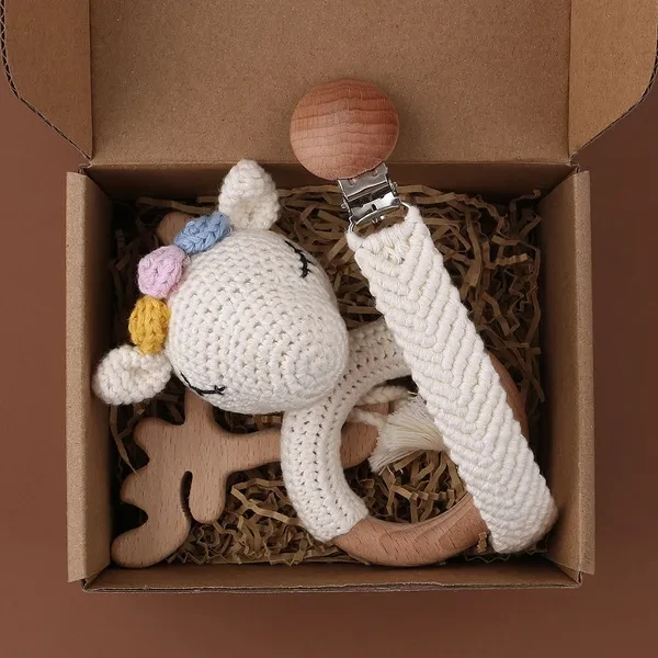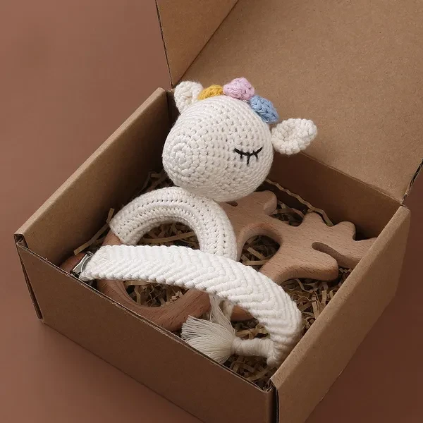 3PCS Handmade Crochet Baby Rattle Toys Animal Beech Wooden Teething Ring Teether Pacifier Chain Clips Set Newborn Shower Gifts Baby Stuff BUT