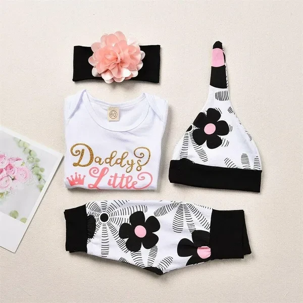 4PCS Set Newborn Baby Girl Boy Short Sleeve Letter Print Romper Top + Floral Pants +Hat +Headband Outfit
