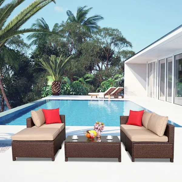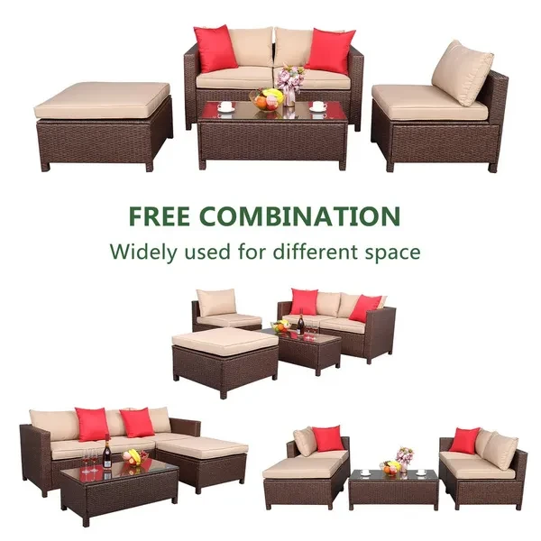 Introductions: Are you looking for a comfortable sofa set for your family? If so, this Oshion 5-Piece Set Rattan Sofa Hanging Legs 2 Corners 1Sofa Without Armrests 1 Foot Drag 1 Rectangular Coffee Table is highly recommended to you. Unlike normal leather sofa, this rattan sofa will give you a different using experience. Adopting high quality PE rattan , it features stable, sturdy and durable, which can meet your family daily demand. So what are you waiting for? Don't hesitate, it's worth buying! Features: 1. Made of high quality PE rattan, stable, sturdy and durable 2. It has a long service time, durable in use 3. The sofa set can meet your family need 4. Soft cushion ensures comfortable seating experience 5. Concise design and exquisite workmanship 6. It can coordinate with any style of decoration Specifications: 1. Material: PE Rattan Iron Sponge Polyester Cloth Tempered Glass 2. Color: Brown Wood Cane Beige Seat Cushion Red Pillow Transparent Glass 3. Product Specifications: Corner Sofa: Overall Size: (29.53 x 29.53 x 26.38)" / (75 x 75 x 67)cm(L x W x H) Seat Size: (25.59 x 25.59 x 14.37)" / (65 x 65 x 36.5)cm(L x W x H) Handrest Height: 67cm Armless Sofa: Overall Size: (25.59 x 29.53 x 26.38)" / (65 x 75 x 67)cm(L x W x H) Seat Size: (25.59 x 25.59 x 14.37)" / (65 x 65 x 36.5)cm(L x W x H) A Footstool: Overall Size: (29.53 x 29.53 x 14.37)" / (75 x 75 x 36.5)cm(L x W x H) Tea Table: Overall Size: (39.76 x 18.9 x 14.17)" / (101 x 48 x 36)cm(L x W x H) Thickness Of Seat Cushion: 8cm Cushion Size: 68 x 39cm Pillow Size: 42 x 42cm Glass Size: (39.37 x 18.5 x 0.2)" / (100 x 47 x 0.5)cm(L x W x H) 4. Product Load-Bearing: Tea Table: 110.23lbs / 50kg Sofa: 330.69lbs / 150kg A Footstool: 330.69lbs / 150kg 5. Weight: 19.62lbs / 8.9kg Package Includes: 2 x Corner Sofa 1 x Armless Sofa 1 x Footstool 1 x Tea Table 3 x Sofa Seat Cushion 3 x Sofa Cushions 2 x Sofa Pillow 1 x Footstool Seat Cushion 1 x Transparent Tempered Glass 1 x Hardware Assembly Parts 1 x English Instruction Manual