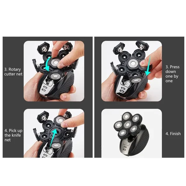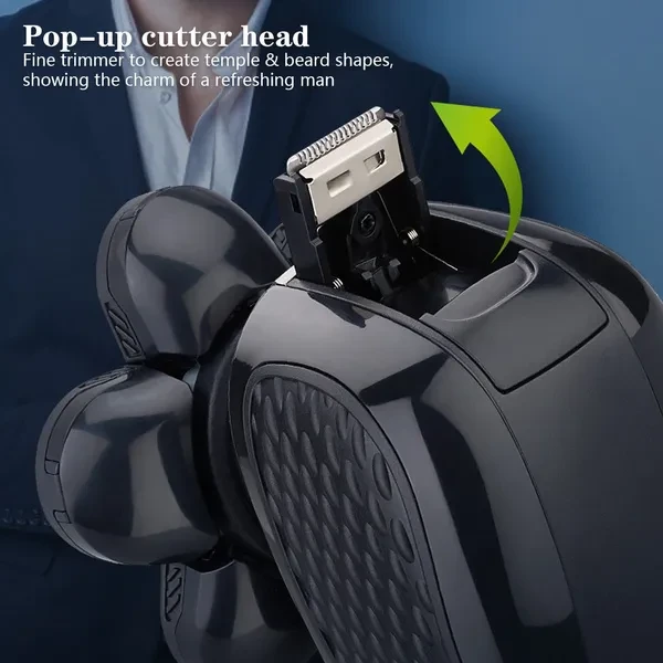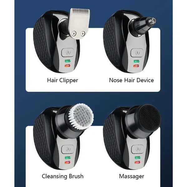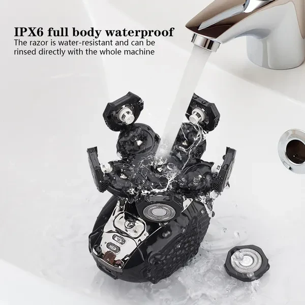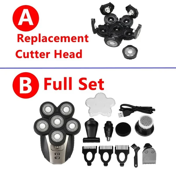 Package Includes B 1 * Host 1 * Razor 3 * Comb 1 * Massager 1 * Hair Clipper 1 * Cleaning Brush 1 * Protective Case 1 * Nose Hair Device 1 * Soft Face Sponge 1 * USB Charging Cable ------------------------------------------------------------ Features : ● 6D 6 cutter head The 6 blades fit smartly, without fear of short stubbles, quickly capture and stabilize the shave, and the blade feels smooth and elastic, adapting to different facial contours ● Ultra-thin double ring veneer knife net Double-ring veneer knife net increases the contact area by 50%, and the cambered knife net closely adheres to the facial contour, effectively shortening the shaving time ● USB charging plug It can be used while charging, and it supports USB port charging such as mobile phone 5V charger, car, laptop, etc. ● Lithium battery lasts long Strong battery life, charging indicator light, charging status is always known, traveling without a charger, 2 minutes a day, about 45 days ● 6 cutter head Fine trimmer to create temple & beard shapes, showing the charm of a refreshing man ● IPX6 full body waterproof The razor is water-resistant and can be rinsed directly with the whole machine. It is easy to clean. You can also apply shaving foam to soften your beard before shaving ● One machine for five uses Detachable cutter head, razor, hair clipper, nose hair device, cleansing brush, massager, create a variety of attractive shapes Specifications : Style(Option): Five in one / Single six cutter head accessories Power: 5W Charge: 2h Expend: 90min Voltage: 3.7V Waterproof: IPX6 Host Size(L * W * H): About 7.5cm * 8cm * 10cm / 2.3 * 3.1 * 3.9