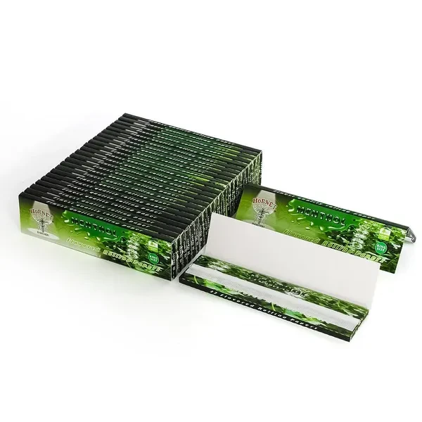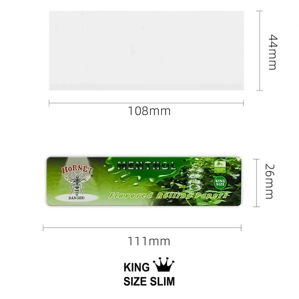 800 leaves menthol flavor rolling paper 108*44 king size smoking paper arabic gum good price to get color:menthol flavored size:king size 108*44mm quantity:32 leaves per pack 25 packs per box total 800 leaves feature:chlorine free,pure natural,100% arabic gum,gmo free,unbleached natural gum,slow burning Thanks For each order, we will also send you 2 test booklets of other papers and 1 filter for free as gifts. Enjoy our paper and service! Enjoy shopping!