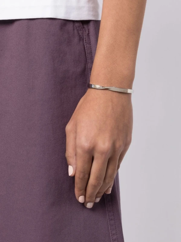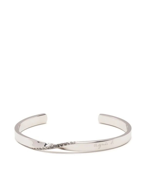 agnès b.'s bangle is a celebration of understated design. Crafted from polished stainless steel with crystal accents, it has a twisted detailing for a modern feel.