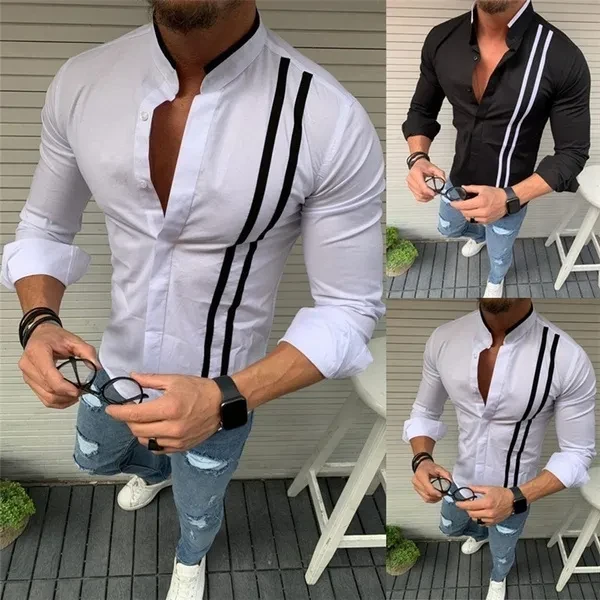 Autumn Men's Casual Fashion Long-sleeved Solid Color Striped Shirt Business Social Slim Men's Clothing