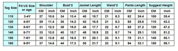 Material: Cotton blend Color: hot pink,purple, blue, orange Size:3-4T,4-5T,5-6Y,6-7Y,7-8Y,8-9Y Package included: 1 x Jacket + 1x pants Please allow 1-3 cm errors due to manual measurement, photo color might be a little different from the actual product due to color display of different monitors. Please choose correct size according to below size chart. size measurements