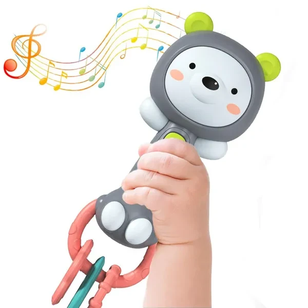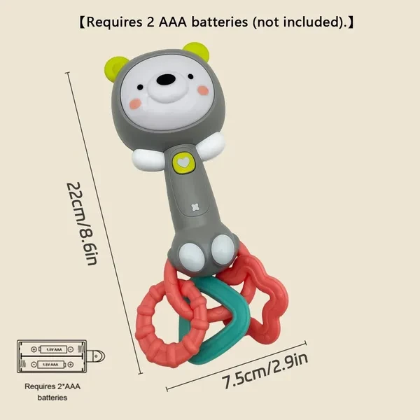 Made of Soft silicone and Plastic, Food grade product for 6 - 24 months' babies. Attract the baby's attention and soothe them when they cry or fuss by playing natural sounds, nursery rhymes, animal sounds and instrument music.The volume can be adjusted and there are four music modes to switch between. Cute animal shape design music rattle for babies 6-24 months that is great for soothing, sensory development, and parent-child interaction. It can be used in various places such as cribs, strollers, car seats and more. Animal faces emit soft light, and touching them can switch music; Baby can also shake the handle Gently to switch music/mode. Requires 2 AAA batteries (not included).
