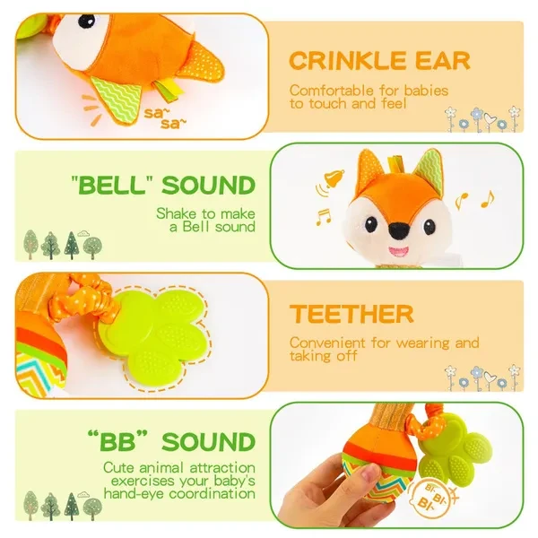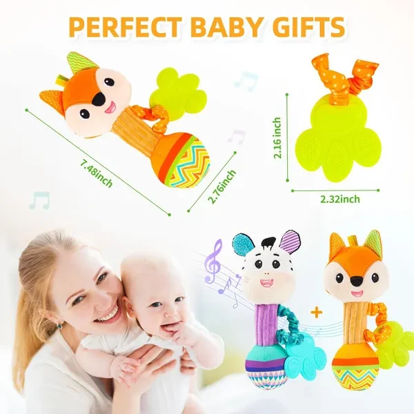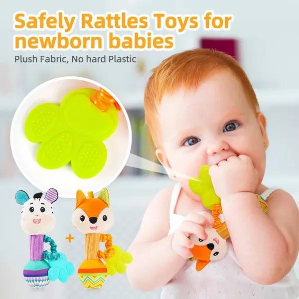 Set of 2 Newborn Rattle Toys :Set of 2 pcs Baby toys are ideal first rattles from birth on up. The rattle makes a fantastic sound when shaking, attracts the baby's attention very easily, stimulates their visual development, and trains the baby's hearing Rattles for Babies 0-6 Months : Inspired by the fact that babies love to grab onto their parent's fingers, These newborn toys are a suitable size for a baby's hand, the rattles and teether toys are lightweight so they are easy for babies to grab, its own to encourage baby's early grasping skills Baby Rattle :Little hands stay active with these colorful Animals making baby explores patterns, textures, and sounds. Ideal for fun, The baby's sensory learning toys are suited for 0-3 months, and baby rattles 0-6 months QUALITY & SAFETY :At home or on the go, these cute Hand rattles Toys have for multi-sensory play. Made from high-quality material, cotton and plush, with no smell, and is non-toxic, safe, and soft for babies to play with. baby toys 0-6 6-12 months NEWBORN TOYS GIFT :Our Koty soft rattle toys are ideal first rattles for babies from birth on up. A special gift for newborn birthdays Would be a great Christmas Gift Idea as Holidays, birthdays, Halloween, Thanksgiving, and New Year for baby boys and girls