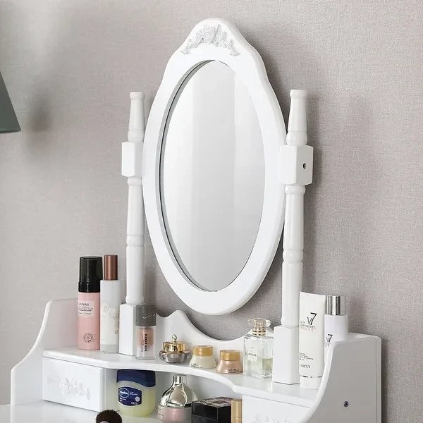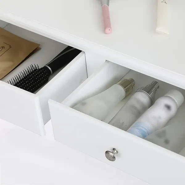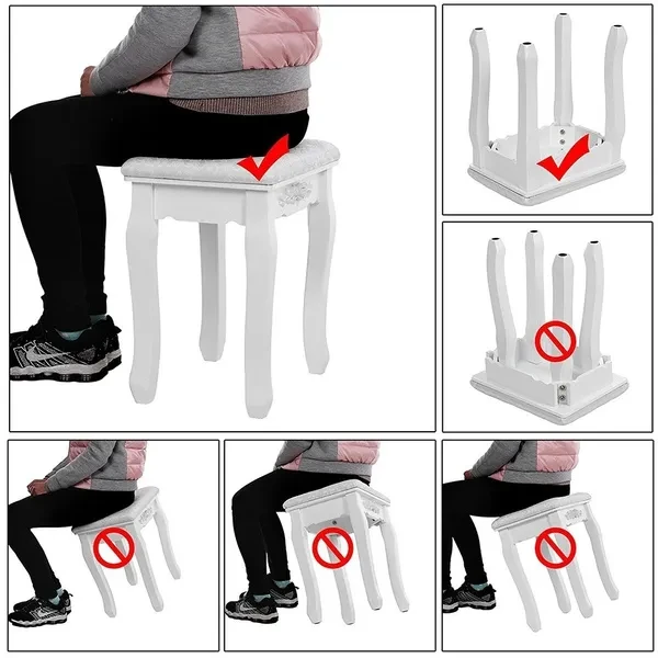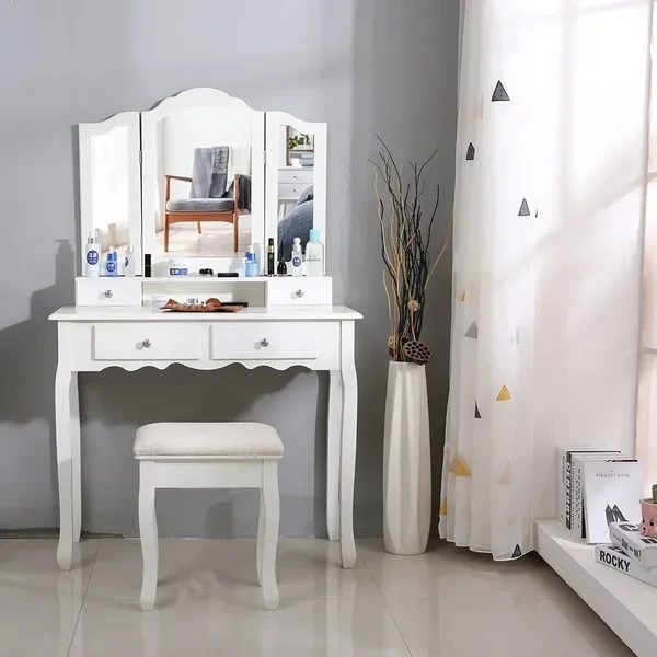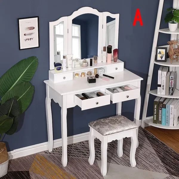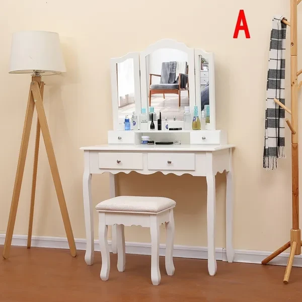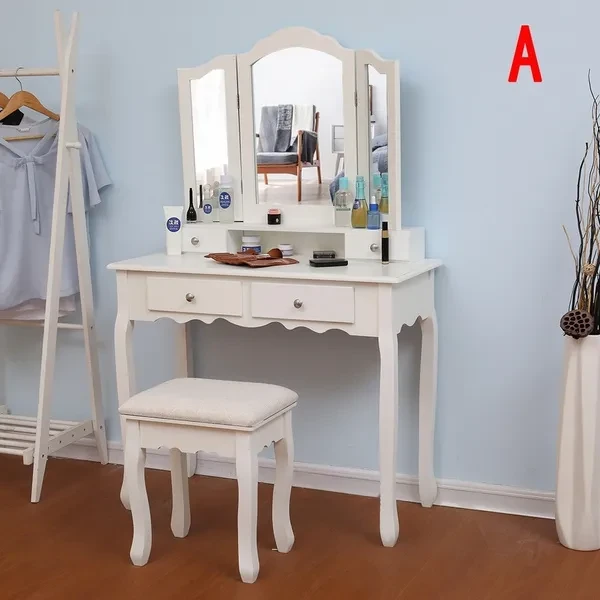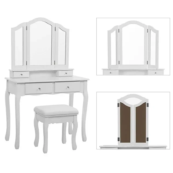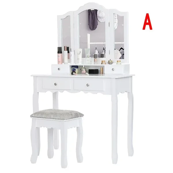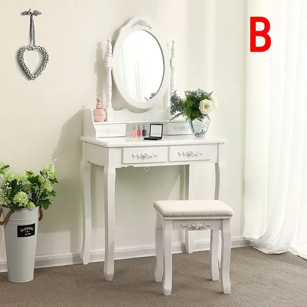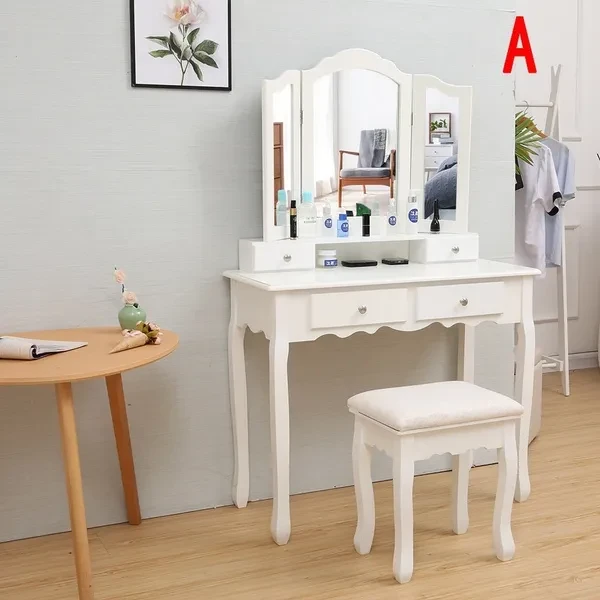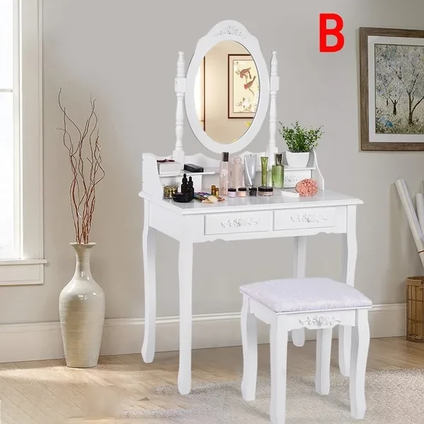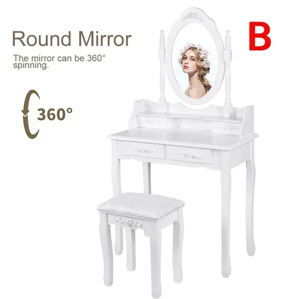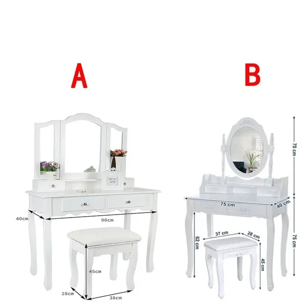 Description: Dressing table: The dressing table has 1/3 mirrors, the mirrors can be rotated or bent (the mirror unit of the A dressing table is not connected to the bottom, so the table can be used as a table alone), four drawers with crystal handles; The table top is made of E1 fiberboard, which is very elegant and has a good glazing effect. The non-slip parts under the legs of the table and stool can prevent accidental sliding and protect your floor (the legs and kicks are made of solid wood, which has a strong and safe effect Specifications: Dimensions: 145 x 90 x 40 cm (A)/75 x 40 x 145 cm (B) Desktop: 90 x 40 cm (A)/75 x 40 cm (B) (length x width) Mirror size: 60 x 71 cm (A)/54 x 38 cm (B) (height x width) Stool size: 45 x 37 x 28 cm Upper drawer size: 16.5 x 6 x 6 cm (A)/17.5 x 7.5 x 5.5 cm (B) (length x width x height) Lower drawer size: 28 x 28 x 6 cm (A)/27 x 22.5 x 6 cm (B) (width x width x height) Fabric: E1 + wood fiber panel. Package Included: Package A: 1 *dressing table 3* mirrors 4 *drawers 1 *stool Package B: 1 *dressing table 1* mirrors 4 *drawers 1 *stool