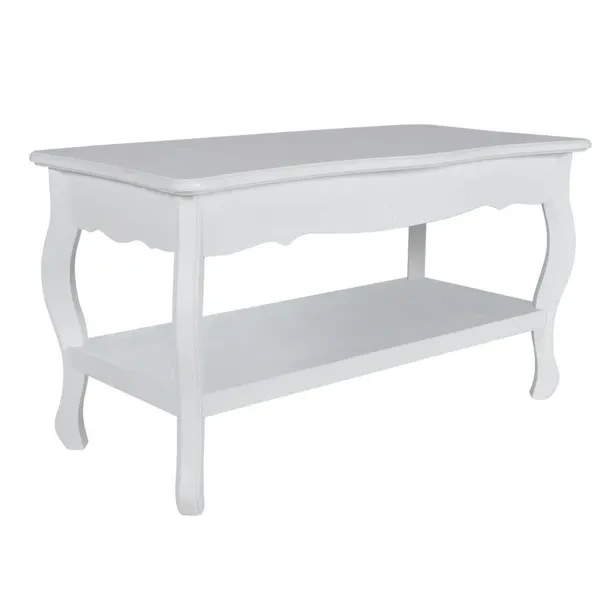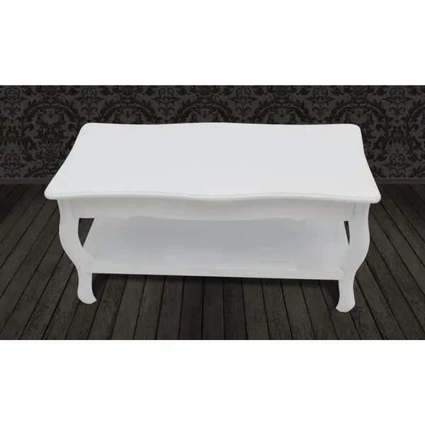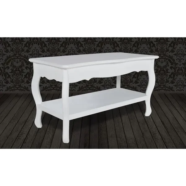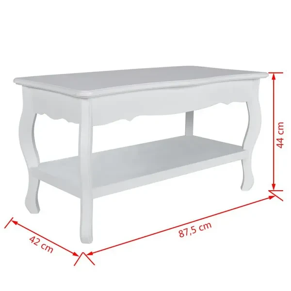 Fashionably designed, this two-level coffee table features lacquer finish in white. With fine craftmanship, it will be an instant upgrade to your living room interior. Whether you are looking for a coffee table to rest your drinks or other necessities, or an end table with storage function, this table has it all. Distinctive open shelves bring artful organization to magazines, books and more, whereas the comtemporary design with a flair of French provincial style compliments the existing decor of your home. Made of high quality solid pine wood, this coffee table is built to last. This listing is for one coffee table. Note: since this furniture is hand-crafted, made of wood and painted white, it may come with a small defect. Overall Dimensions: 87.5 x 42 x 44 cm (L x W x H) Colour: white Material: MDF,brushed pine