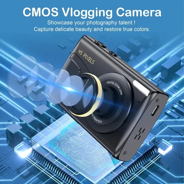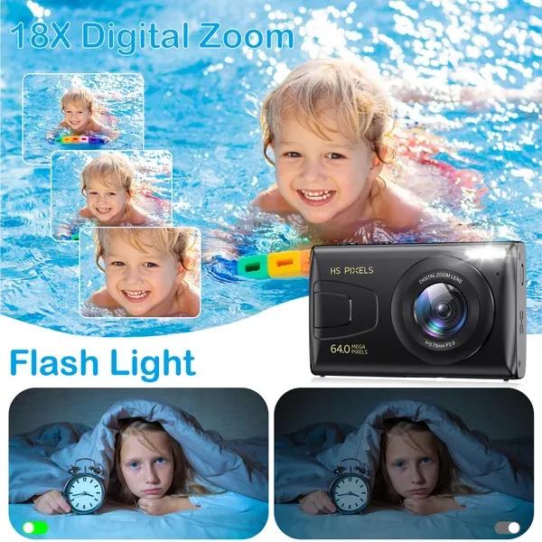 Description: ​?【Shoot Beauty with Easy】The kids digital camera captures high-clarity 4K videos and 64MP photos with a high-level CMOS sensor and Anti-Shake function.Let kids easily shoot the family warm picture. Simple to use, no need for complicated operation, only need to install the battery and ?SD card(NOT INCLUDED), switched it on within 2S. Tap the shutter, enjoy the fun of photography! ?【Combine Education with Pleasure】The camera for kids combine education with pleasure,the children can listen to music and memorise words while developing a hobby in photography.So why not buy one of these kids cameras to train a future photographer?(Tips:Plug in the Headphones Before Playing Music!) ?【Compact and Portable Camera】Special mini-size design for kids to easily handheld, this vlogging camera is small and lightweight, fits in kids' hands perfectly.The weight only 0.5 Lbs.Comes with a lanyard hang, it's portable for them to carry and move, and compact for travel and camp.Equipped with one high-capacity battery, solve the worries of travelling without electricity. ?【Explore More Ways to Play】The camera for photography is equipped with 10 filter modes and 18x digital zoom, so children can use their creativity to take photos according to their environment and needs. In addition, the camera is equipped with anti-shake, time-lapse, webcam and smile detection, etc.. Waiting for kids to discover! Package Includes: Camera * 1Battery * 1 USB Cable * 1 English Manual * 1 32G TF Card*1 Card Reader*1