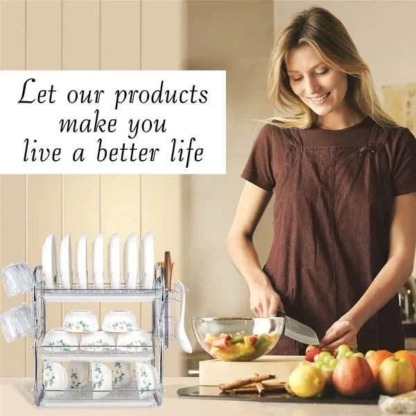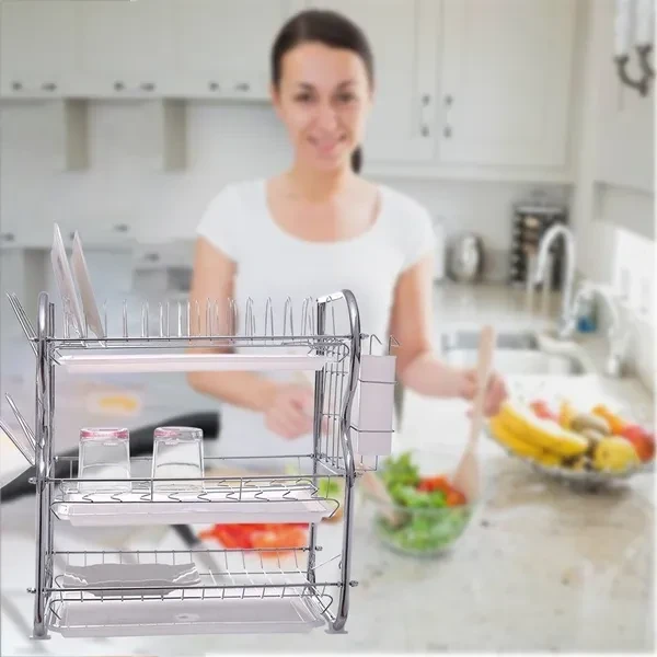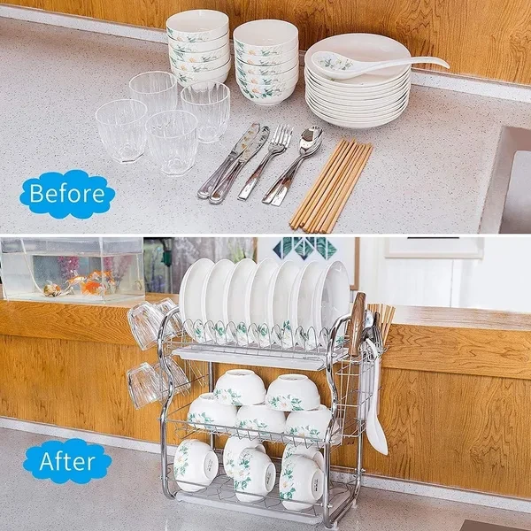 Our dish rack are designed in 3 layers and can hold more bowls and plates. The hooks on the side can hold 6 cups、multiple forks and chopsticks. Modern design 3 tier kitchen dish drying rack are made of new chrome-plated rust-proof material for stability and durability. Each floor has a drawer-type water tray. The water tray has a food grade PP material, which is environmentally friendly and flexible. The first layer height is 6 cm. It can be placed more firmly and placed on the plate for quick draining. Each floor has a water tray to collect dripping water and easy to remove. The bottom has a non-slip mat that can be placed firmly on the kitchen counter, each floor is made up of 8 screws and nuts, making the dish drying rack stronger Use our dish rack to better manage and store your kitchen counter, keeping your kitchen away from the messy, slippery, Generously sized and exquisite style that makes it suitable for more families. Get one that will last a lifetime and Will provide value to your family. The size of this dish rack is 16.5'' * 9.84'' * 17.7'' ,Top shelf height 2.4'',Intermediate interval 5.5'',Bottom spacing 6.3