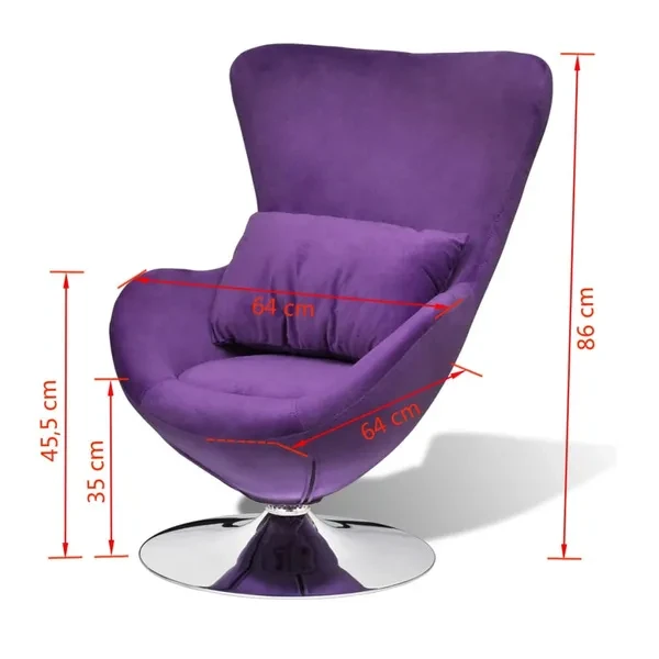 This comfortable swivel armchair in a unique, modern design combines style with functionality. Its sturdy iron stand is equipped with a rotating mechanism that enables it to rotate freely through 360 degrees. A detachable, fluffy seat cushion is also included. Note: Please check the size carefully before you decide to buy. Material: plywood and iron Color: purple and silver Overall size: 64 x 64 x 86 cm (W x D x H) Seat size: 39 x 42 cm (W x D) Cushion size: 43 x 28 x 18 cm (L x W x H) Seat height: 35 cm Backrest height: 58 cm Diameter base: 50 cm Armrest height from the floor: 45.4 cm Material: Polyester: 100%