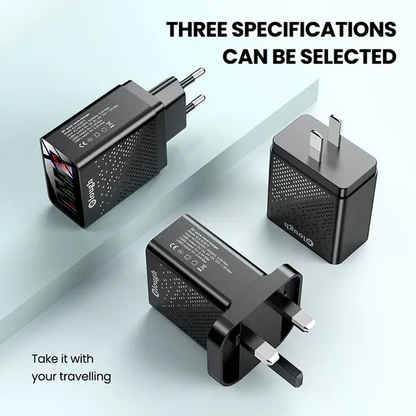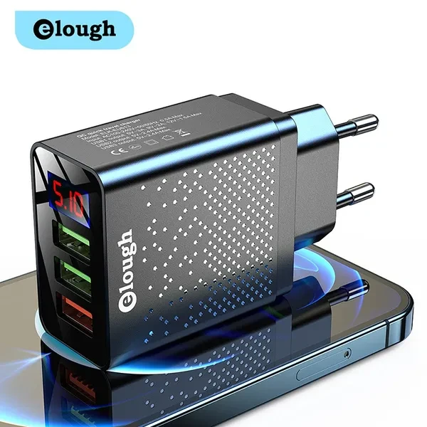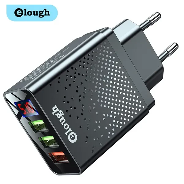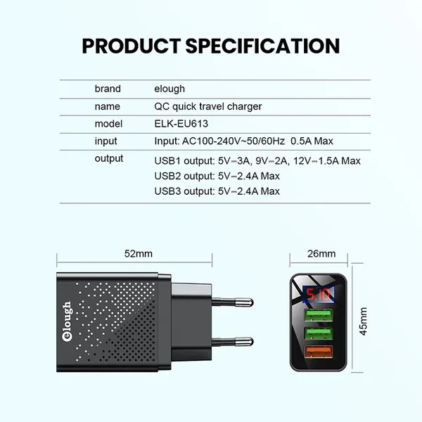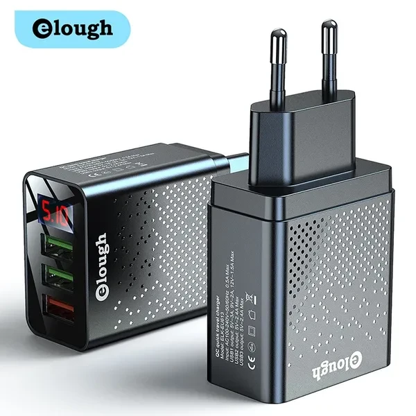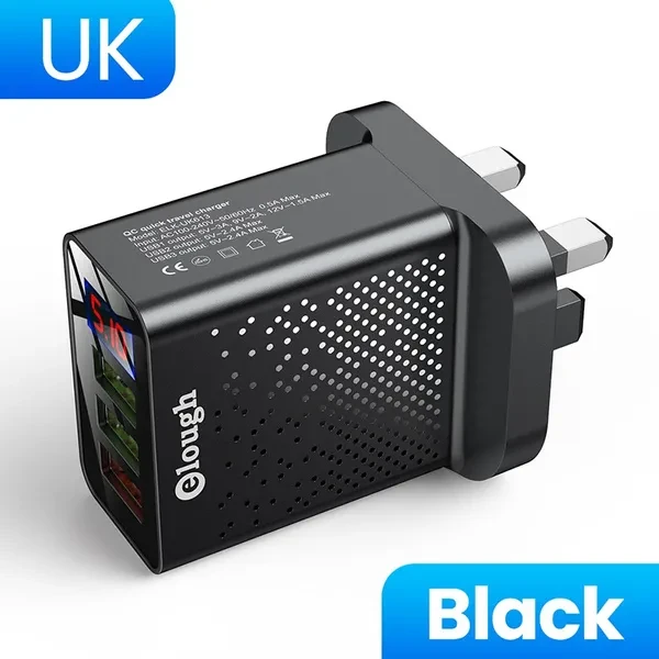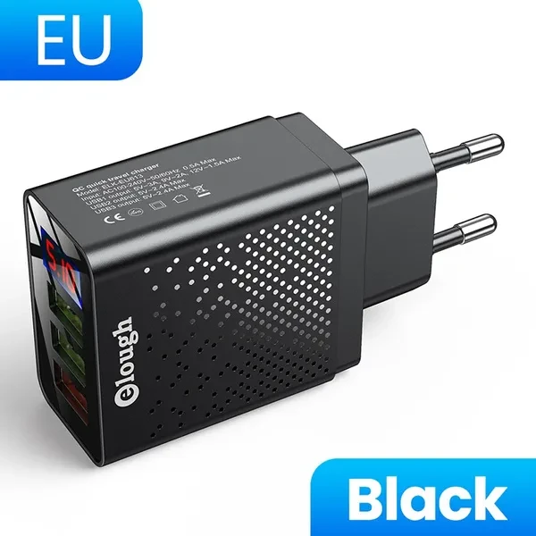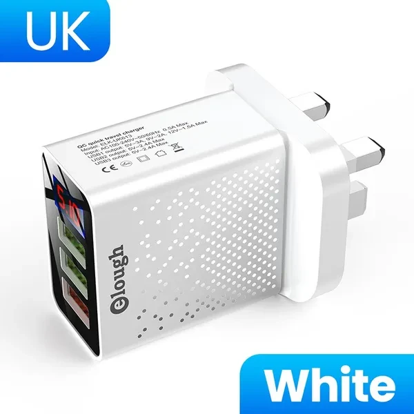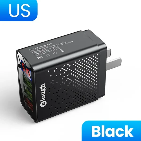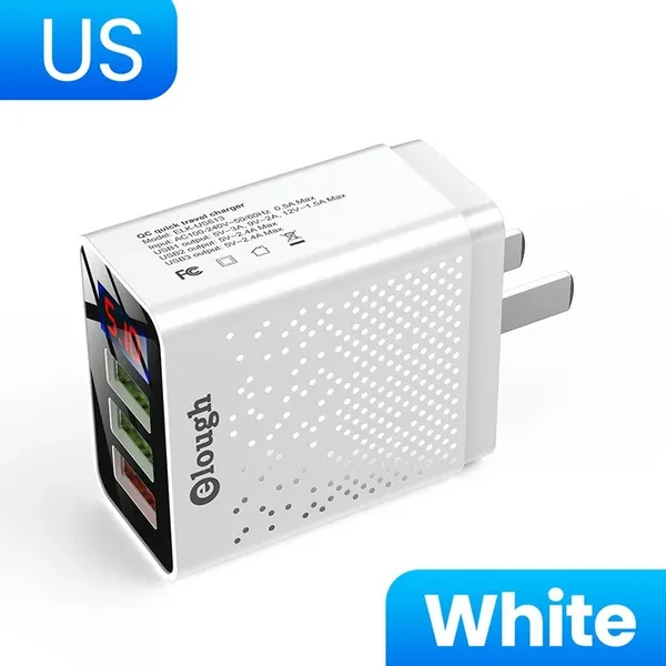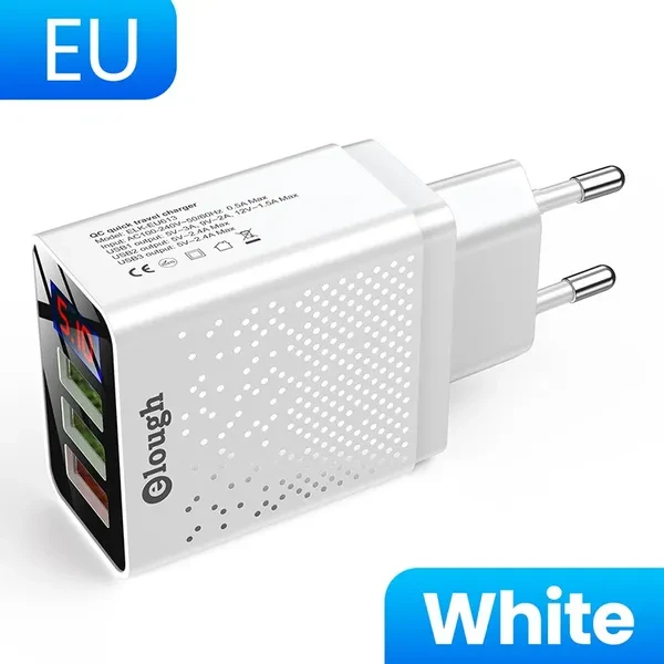 Brand Name: Elough Name: QC Quick travel charger. Charger type: Fast 3 USB Ports + Digital Display. Input: AC100-240V, 50-60HZ, 0.5A Max. Output: USB1 Output: 5V-3A, 9V-2A,12V-1.5A Max. USB2 Output: 5V-2.4A Max. USB3 Output: 5V-2.4A Max. Color : Black / White. Plug : EU Plug/US Plug/UK Plug. Type: Travel Charger. Package content: 1*3U Digital Display Fast charger Feature 1 : USB charger/Travel charger/Wall charger. Feature 2 : Quick Charger 3.0./ QC 3.0 Mobile phone charger. Feature 3 : Digital Display Fast charging. Feature 4 : Power bank / phone charger / portable charger. Feature 5 : wall charger/ multi usb charger /QC 3.0charger /multi-port Charger. Feature 6 : EU Plug Charger / US Plug Charger / UK Plug Charger. Compatible Model 1 : Travel USB Charger for Huawei for Xiaomi LG SONY. Compatible Model 2 : Fast Charger for Xiaomi mi 9 Redmi note 8 7 4x. Compatible Model 3 : Usb charger for Iphone 12/11/7/ 8. Compatible Model 4 : Quick Charger 3.0 for Samsung Galaxy S10 S9 S8 Plus charger.