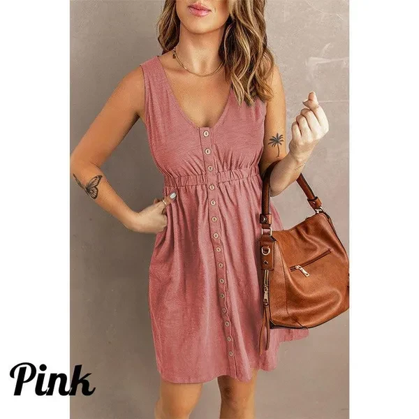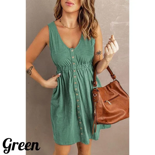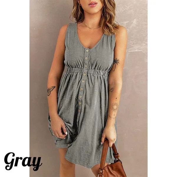 Fashion Womens Casual Sleeveless Button Down Elastic Waist Swing Loose Plain Short Dresses Plus Size Tank Tops Dresses