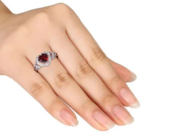 Garnet Heart Ring 1.50 Carats (ctw) in Sterling Silver Sleek sterling silver is set with a heart shaped rich red garnet at its center in this promise ring featuring the birthstone of January. Beautifully crafted in 0.925 sterling silver with a Polished Finish Stone Type: Garnet; Color: Red; 1.4 CTW; Quantity: 1; Heart Cut; Heart Shape; Dimensions: 7x7 mm; Natural; Prong Setting Stone Type: Diamond; Color: G-H; Clarity: I1-I2; .085 CTW; Quantity: 17; Brilliant Cut; Round Shape; Natural; Prong Setting Garnet Gemstone is the Birthstone for the Month of January This Heart Ring is the perfect gift for any birthday, anniversary, holidays, thank you, thinking of you, or for any reason at all SKU: 68DLG49362GA-P