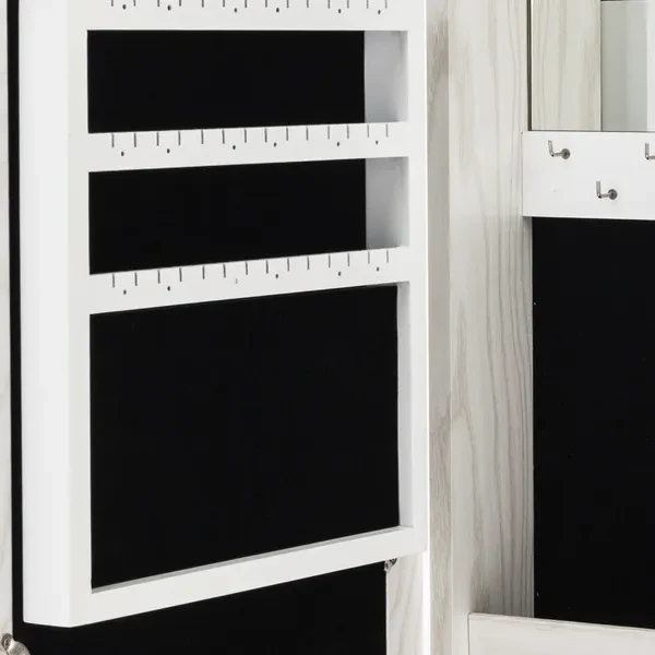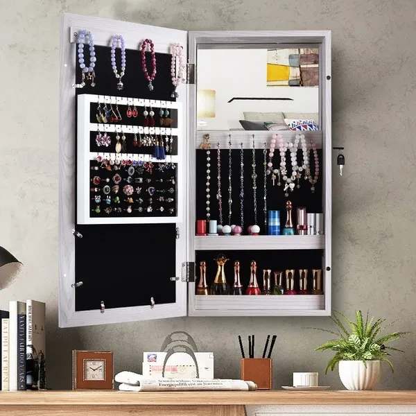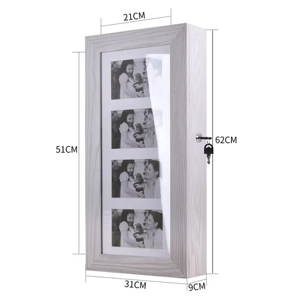 Introductions: Here we are highly recommended this Simple PVC Wood Grain Coating Photo Storage Damp-proof Jewelry Mirror Cabinet to you. It becomes a necessary beauty tool. Made up with durable and reliable material, it can be used for a long time! It not only can be used as a mirror, but also is a useful storage rack! All of the internal space has a villous render; it feels soft and comfortable, and not easy to damage the ornament place in it! You can't miss it anymore! Features: 1. It has a spare mirror inside 2. All of the internal space has a villous render; it feels soft and comfortable, and not easy to damage the ornament place in it 3. The mirror is smooth and real, without distorting mirror effect 4. Solid plate base design, security and firm 5. Large space, with all kinds of hook, meet all your place demands. 32 ring slots, 4pcs hooks and 3 rows earrings shelf with 14 screens 6. Especially space designed for storing photos 7. A complimentary key firmly lock the precious items. To ensure the safety of your property 8. Perfect decorates bedroom and sitting room Specifications: 1. Material: High Density Board & Glass Mirror & Velvet Lining 2. Color: White 3. Cabinet Dimensions: (11.81 x 3.54 x 23.62)" / (30 x 9 x 60)cm (L x W x H) 4. Net Weight: 7.94 Lbs / 3.6 kg Package Includes: 1 x Jewelry Cabinet 1 x Accessories Package 1 x Instructions