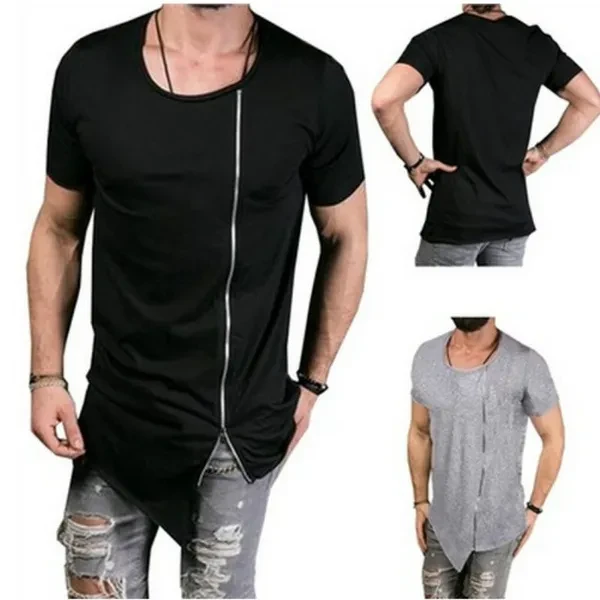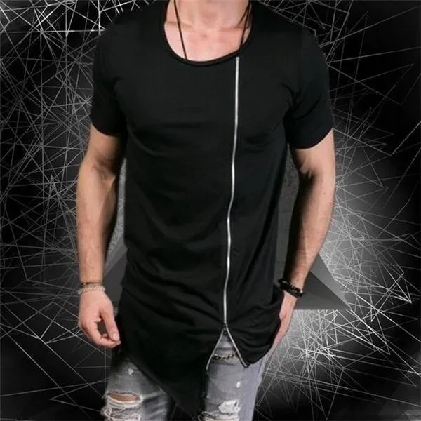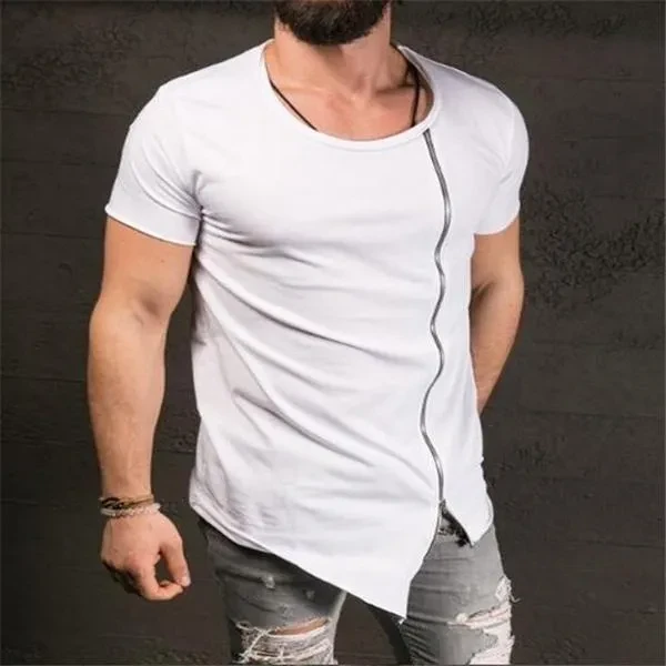 Hot Men S Fashion Irregular Short-sleeved T-shirt Slim Zipper Big Neck T-shirt Casual Summer Solid Color