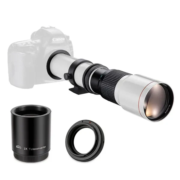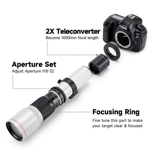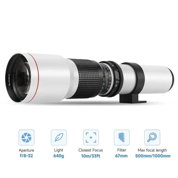 A Photographer's Essential Tool, High-power 500mm telephoto focal length, add 2X Teleconverter doubles the power of your lens to 1000mm. High index, Multi Coated Low-dispersion Glass imported from Japan, Filter thread: 67mm Manual focusing telephoto lens can be used for DSLR/SLR/mirrorless cameras Users can mount the lens on all types of digital reflex cameras through the universal T-mount. Available for Canon, Nikon.SONY, Pentax, FUJI, MFT Macro 4/3 Camera T mount adapter include fit NIKON SLR cameras. other adapter can buy from our store. T2-AI adapter Compatible with Nikon F Mount D5000, D5100, D5200, D5300, D5500, D5600, D7000, D7100, D7200, D7500, D70, D80, D3000, D3100,D3200, D3300, D3400, D90,D100, D200,D300, D300S D500, D600, D610, D700, D750 D800, D810A, D810, D850 Digital SLR Cameras etc Feature Multi-Coated Lens Elements Ultra-telephoto Lens Built-in Tripod Collar Fixed Aperture, Manual Focus Lens,Camera-specific T-mount Adapter Included Perfect for Sport action shots,Wildlife Photography and Astronomy Photos