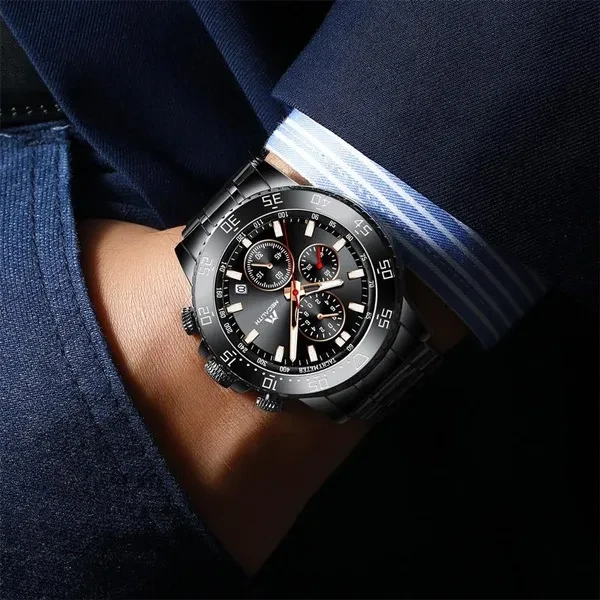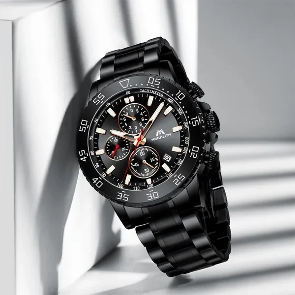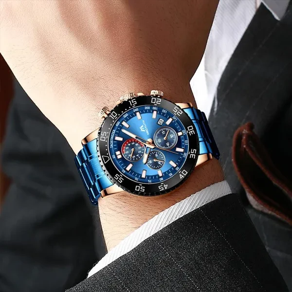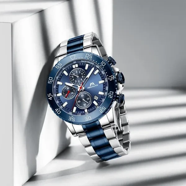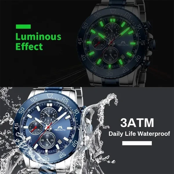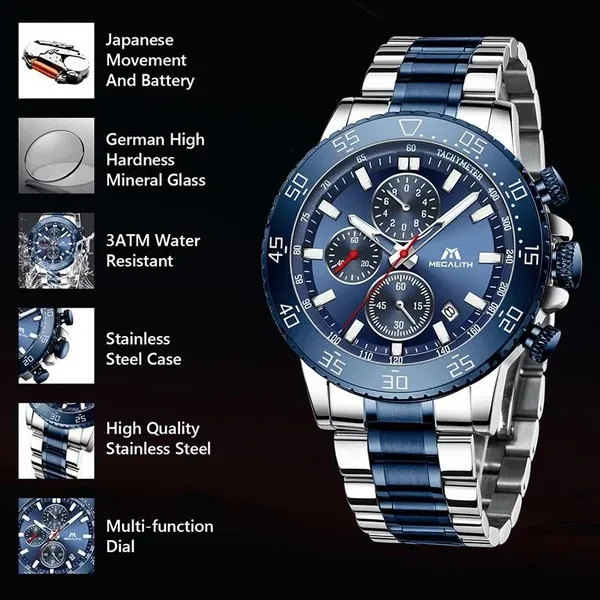 MEGALITH Mens Watches Men Chronograph Stainless Steel Blue Watches for Men Waterproof Analogue Quartz Wrist Watch Fashion Luxury Business Casual Watch Uhren Relógio Relojes Montre