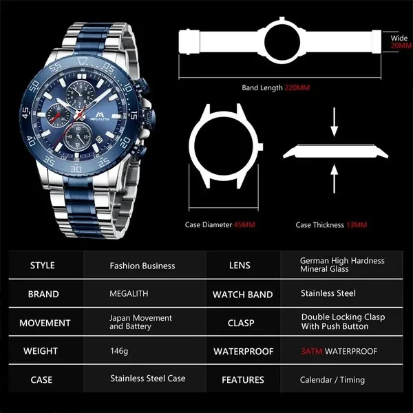 ★MEGALITH BRAND★ ★Specification★ Dial Case Diameter: 45 mm / 1.77 inch Dial Case Thickness: 13 mm / 0.51 inch Band Width: 20 mm / 0.78 inch Band Length: 220 mm / 8.66 inch Watch Weight: 146 g / 5.14 oz - Multifunctional: Chronograph, Luminous Pointer, Date Display - 3ATM Water Resistant: Not suitable for swimming, bathing, diving. *Nice Gifts* : The watches are great gifts, birthdays, friends, loved ones, father's day, graduation gifts, valentines day gifts, or as gifts for business and parties. ★Package Included★ 1 * MEGALITH Watch 1 * Watch Instruction Manual 1 * Watch Link Remover 1 * Exquisite Gift Packaging 1 * Microfiber Cleaning Cloth ★NOTE: 1. Clean the strap and watch face by the microfiber cleaning cloth provided on regular basis is highly recommended. 2. Too much water contact will shorten watch life. 3. Please never to press any button in water and avoid hot water. ★Tips: 1.If you need to buy more than 2 watches, you can place multiple orders! 2.In order to better complete the transaction, please sure your receiving address and order information are correct. If you have any questions, please feel free to contact Customer Services Support Team! You will find more Amazing WATCHES if you visit our Store! Happy Shopping!