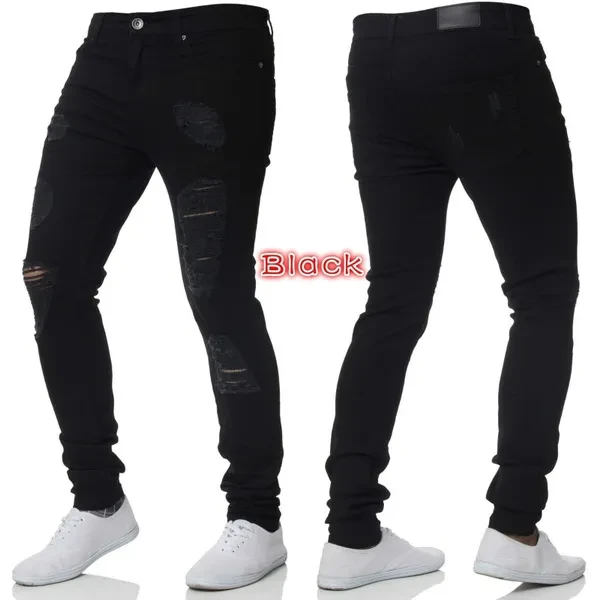 Mens Casual Skinny Jeans Pants Men Solid black ripped jeans men Ripped Beggar Jeans With Knee Hole For Youth Men