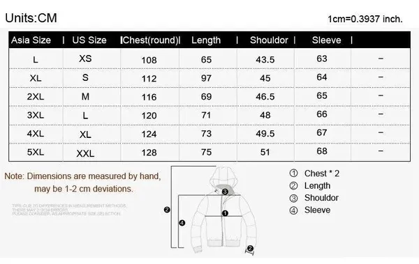 Measurement U.S Size Shoulder Chest Length Sleeve XS 43cm(16.9") 100cm(39.3") 65cm(25.5") 64cm(25.1") S 45cm(17.7") 104cm(40.5")66cm(25.9") 65cm(25.5") M 46cm(18.1") 108cm(42.5") 67cm(26.3") 66cm(25.9")
