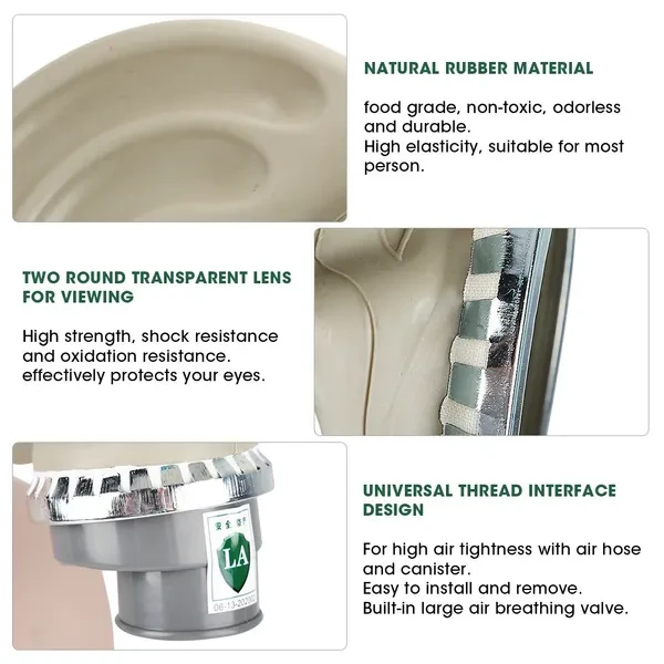 Features: 1. Made of natural rubber material, food grade, non-, odorless and . High elasticity, suitable for most person. 2. Two round transparent lens for viewing, which is high strength, shock resistance and oxidation resistance, effectively your eyes. 3. interface design for high tightness with hose and canister. Easy to install and remove. Built-in large breathing valve. 4. Use with different size of canisters for different environment to prevent inhaling harmful gases and steam and particulate matters, etc. 5. Adopts tight sealing at lens and breath ports, provides best for you. Specifications: Material: Rubber Color: Grey White Packing List: 1 * Gas Mask Note: Only include gas mask, canister and hose are not included.