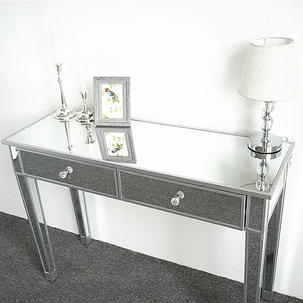 This is our 2 drawers glass mirrored makeup table, which has a beautiful appearance. It is perfect for any room, this mirrored makeup table will glamorously complement your home. With its mirrored finish, it adapts to any surroundings without overpowering yet, catches your eye with its unique presence. Shimmering mirror reflects across the composition. The practical size and function works as well in the living room as it does in the bedroom. Do not hesitate to buy one!
