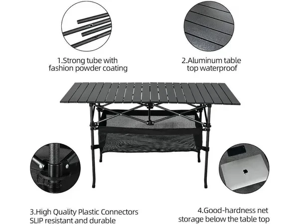 Convenient Basket Storage: An unique capacious storage mesh basket can be assembled underneath this table-top, to put small garden tools, toys, bags, mobile-phones, laptops inside. Easy to Assemble and Detachable: Compared with other folding table which can only fold the legs, our table can be overall foldable including the table plate. And it only takes few minutes to assemble. Premium Durable High Quality Material: This camping table is made of upgrade aluminum and surface is water-proof, stain-resistant, lightweight, and legs frame are made from strength steel, make it sturdy and durable. Multi-Function Folding Table For Daily Use: This portable folding table can be used as an outdoor dining table, BBQ Table laptop table, gaming table. Perfect for camping, beach, backyard, BBQ, party, patio, picnic. Portable And Easy To Carry With: Overall Dimensions: L 47in* W 21.65in * H 26.7in. Item Net Weight: 13.2lbs. Easy to be folded and set up, this table can be storage into a matched handbag.