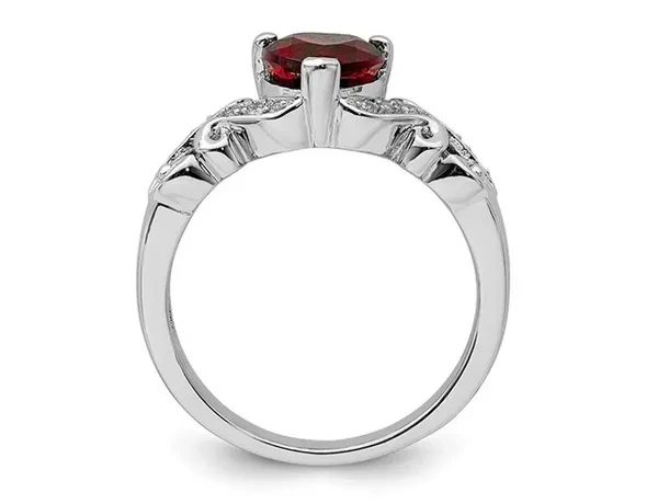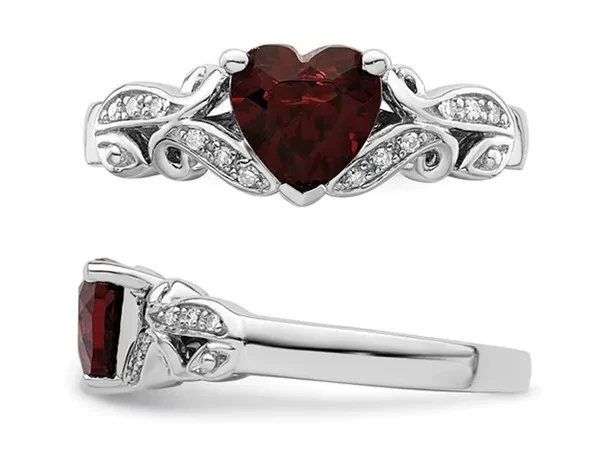 This classic heart promise ring features a beautiful rich red natural garnet in a rhodium plated heart shaped sleek sterling silver setting. Garnets are the featured birthstone of the month of January.
