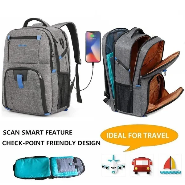 Name: Laptop travel Backpack Demensions: 20.5 x 12.5 x 7.0 inches; Fits up to 17.3 inches laptop. Weight: 1.2KG Color: Black Grey Blue Material: Oxford Nylon cloth; 210D waterproof polyester lining Features: 1. USB 2.0 Charging port design. Built-in USB cable. Use it to connect your own power bank, then connect your phone with original USB cable to the USB port, you could charge your phone conveniently. 2. Construction: 3 compartments + 1 front pocket. ***Independent laptop compartment Full of foam padding to protect laptop. 1 Velcro belt to fix the laptop, long zipper to zip and makes it easily to take out the laptop. Fits up to 17.3 inches laptop on market. ***Independent clothes compartment This compartment designed for keeping 2--3 days summer clothes, ideal for your business day or daily use for school, travel or hiking. ***Independent laptop accessory compartment This compartment designed for keeping laptop accessory like power cord, mouse, keyboard. ***Functional front pocket This pocket designed for keeping cards, wallet, phone and pens for daily use and quick taking. ***2 mesh side pocket for keeping water bottle and umbrella. 3. Lightweight design is easy for carrying. The top grab handle offers quick grab-and-go style. Ergonomic design ensures the dispersion of gravity of the fulled bag. 4. Personalized good looking appearance with large capacity, ideal for using as book bag, rucksack schoolbag, satchel, for daily use at school, work, weekend, outdoor holiday, outdoor activities, occasional travel, gyms, hiking, biking etc. Nice size admirably suits college students, teen girls boys and adults.A practical laptop travel backpack for you! 5. Fit for Dell / Lenovo / Toshiba / HP/ Macbook etc.More room for keeping 2--3 days summer clothes for travel.Suits for College students, businessmen, office staff, teens, students, outdoor gens etc. Package include: 1 x Laptop Briefcase