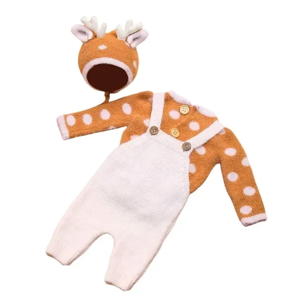 Newborn Baby Photography Outfit Christmas Themed Deer Costume Knit Suspenders Pants and Dot Top with Antler Hat