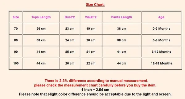 What You Get:3pcs/Set Girl Outfit Fashion design,100% Brand New, high quality! Material: Cotton Blend Color: As picture show Style: Floral Size: 70 80 90 100 Size Chart: Size Length Bust*2 Pants Age 70 36 cm 23 cm 36 cm 0-3 Months 80 38 cm 24 cm 38 cm 3-6 Months 90 41 cm 25 cm 41 cm 6-12 Months 100 44 cm 26 cm 44 cm 12-18 Months There is 2-3% difference according to manual measurement. please check the measurement chart carefully before you buy the item. 1 inch = 2.54 cm Please note that slight color difference should be acceptable due to the light and screen.