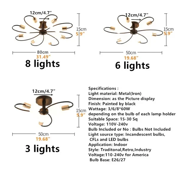 Specifications : Light material: Metal(Iron) Dimension: as the Picture display Finish: Painted by black /white Wattage: 3/6/8*60W depending on the bulb of each lamp holder Suitable Space: 20-30 Sq Voltage: 110V-240v Bulb Included or No : Bulbs Not Included Light source type: Incandescent bulbs, CFLs and LED bulbs Application: Indoor Style: Traditonal,Retro,Industry Voltage:110-240v for America Bulb Base: E26/27 (The bulb is sold separately) Idea for installing in bedroom,living room,foyers,dining room,kitchen,decorative lighting,barn wood,rustic/industrial decor,bar,cafe and hotel Packing include: 1pcs x Lamp base