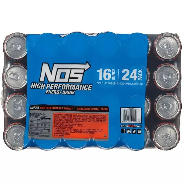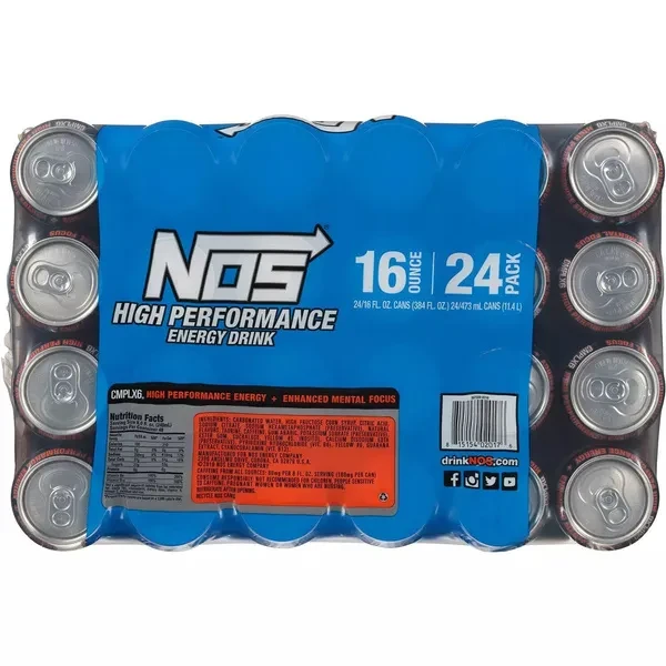 Delivery is not available to Puerto Rico, HI, AL,AE, APO/FPO or PO box addresses Highlights:- 24 cans - 16 fluid ounces each Provides energy and enhances mental focus Fortified with electrolytes Contains natural caffeine About this item:- NOS® High Performance Energy Drink provides extra energy and enhanced mental focus to help you get through your day. Do You Sometimes Feel Tired And Run Down Right in the Middle of Your Busy Day? You have a lot of things to get done today. There are meetings to attend, deadlines to meet and reports to write, so you don't have time to fool around with energy drinks that promise more than they deliver. That's why you trust NOS High Performance Energy Drink to keep you focused and mentally alert throughout your busy day. What Makes NOS High Performance Energy Drink so Much Better Than Other Brands? Those other guys sell tiny little shots or cans of soda pop that contain a little bit of caffeine. NOS High Performance Energy Drink delivers a serious energy boost in a delicious, thirst-quenching beverage that you can enjoy anytime you feel the need. NOS High Performance Energy Drinks contain natural caffeine, taurine, guarana, B6, B12 and L-theanine. How Many Cans of NOS High Performance Energy Drink Will You Get? Each package contains a total of 384 ounces. That's three gallons of the most satisfying, thirst-quenching energy drink available anywhere, at any price. You'll have enough to share with your family, friends or co-workers. Once they experience the refreshing boost of energy that comes in every can of NOS High Performance Energy Drink, they'll be asking for more, so you'll probably want to buy an extra case and hide it for yourself. When you need serious energy in the middle of your hectic day, don't settle for wimpy shots and soda pop. Buy a case of NOS High Performance Energy Drink, the only energy drink to deliver on its promise to give you the boost of energy that you need, in a delicious, thirst-quenching drink that you'll love.