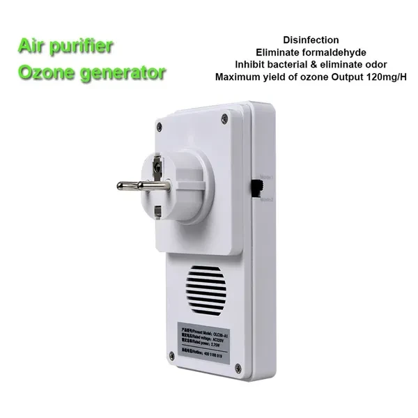 EU Plug in Ozone Air Purifier O3 Generator Machine for Room Office Bedroom Toilet Home Travel Descriptions: Aldehyde-eliminating anti-bacterial device uses the corona release technology with the latest high-temperature ceramic tube as the medium. The potent ozone genrated can effectively inhibit the growth of harmful of harmful bacteria and eliminate oders. The machine dual-mode is ptional. Once the mode 2(Intelligent Auto Mode)is set,the machine is under 24-hour cycle operation,which overcomes the trouble of frequently turning on and off machine.Mode 1(normally open mode)has better effects on the target space where pollution is more serious. The ozone quantity is limitless and adjustable. The macine is suitable for the space below 30 square meters. Specifications: Pulg Type: EU Plug Rate Power:2.75W Standby power:0.19W Rated Air Flow: 6.8m3/hour Rate noise: 35dB Applicable area: ≤30m2 Size: 150*98*73mm Applicable temperature: -10℃~55℃ Maximum yield of Ozone: 120mg/h NOTE: This product uses the working principle of generating ozone with the corona release technology.Ozone has a strong oxidation with light Houttuynia oder,which may discomfort a par of population.Therefore,we recommend that user should choose the smart mode to enjoy healthy life. Package included: 1 Set Plug in O3 Air Purifier Ozone Generator Machine