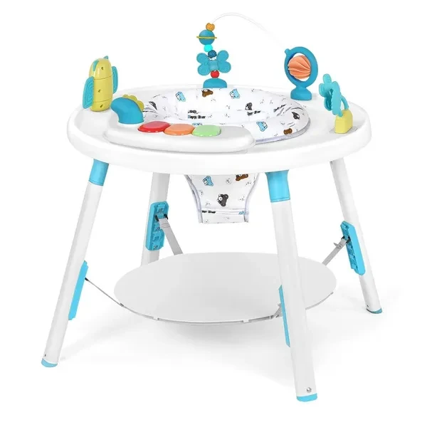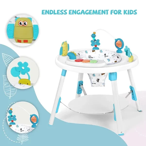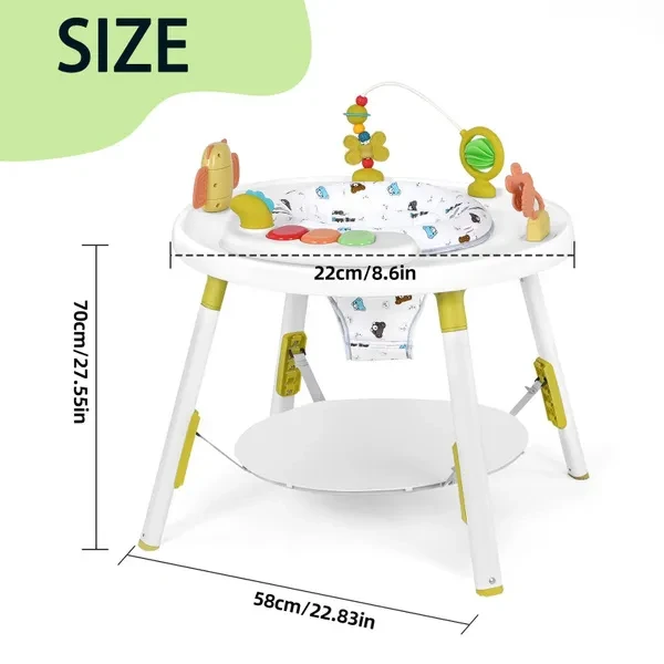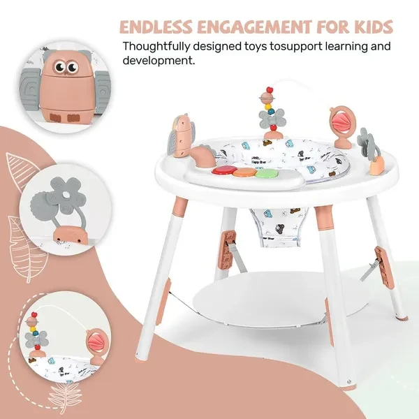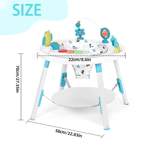 This 3-in-1 baby activity center serves as a play center, baby walker, and bounce house. It is designed to grow with your baby, providing endless entertainment and developmental benefits from infancy to toddlerhood. Equipped with a variety of detachable toys, this activity center encourages sensory exploration and fine motor skills. The bright colors, textures, and sounds stimulate your baby's curiosity and cognitive development. The activity center features adjustable height settings to accommodate your baby's growth. The 360° rotating seat allows your little one to reach all the toys while promoting muscle strength and balance. Safety is our top priority. This activity center is made from durable, non-toxic materials and provides a safe play environment for your baby. The wide, stable base prevents tipping and the padded seat ensures comfort while playing. The activity center is designed for busy parents. The seat cover is machine washable and the removable toys can be wiped down with a damp cloth, making maintenance quick and easy.