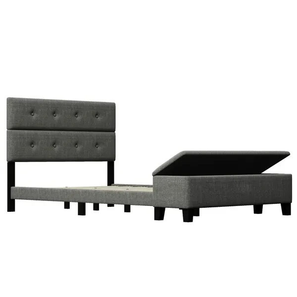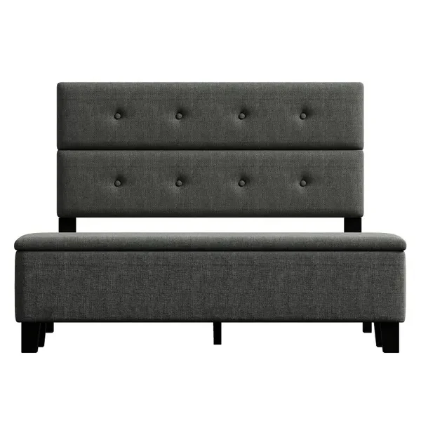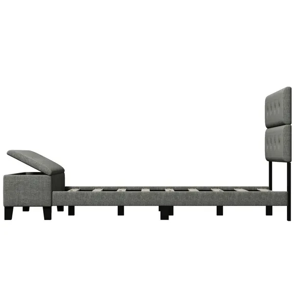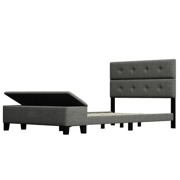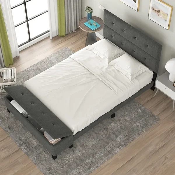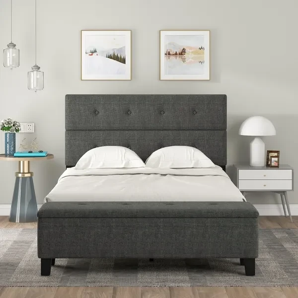 This bed features an elegant headboard design with upholstered linen and durable construction. A classic silhouette is accentuated by tufted button accents, this bed is perfect for a variety of bedroom styles. Coming with a large case at the end of the bed, this bed provides great storage function, and the case can also be used as a bench when closing the lid. For added extra stability, the bed features extra support legs under the middle of the bed, 11 support legs in total provides great weight capacity. With high-quality material and solid construction, this bed can bring you different experience. 1.This platform bed comes with sophisticated stitching, button tufting and neutral-toned fabric. 2.The included large case is available for storage and can be used as a bench as well. 3.Designed with a clean silhouette and a hue of elegance, the bed suits all styles of home. Size:1 Description Material:Fabric Colour: Gray Numbers of slat: 9 Function: Platform bed Numbers of package: 1 Spring box: No need Dimensions Bed:54.7’’ x 80.7’’ Total height:43.3” Case:15.3’’ x 54.7’’ Bed weight capability:450lb Recommended mattress thickness:8’’-10” Size:2 Description Material:Fabric Colour:Gray Numbers of slat:9 Function:Platform bed Numbers of package:1 Spring box:No need Dimensions Bed:64.5’’ x 80.7’’ Total height:43.3” Case:15.3’’ x 64.5’’ Bed weight capability:550lb Recommended mattress thickness:8’’-10”