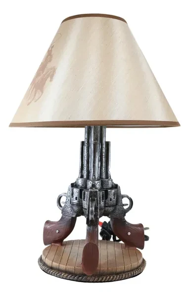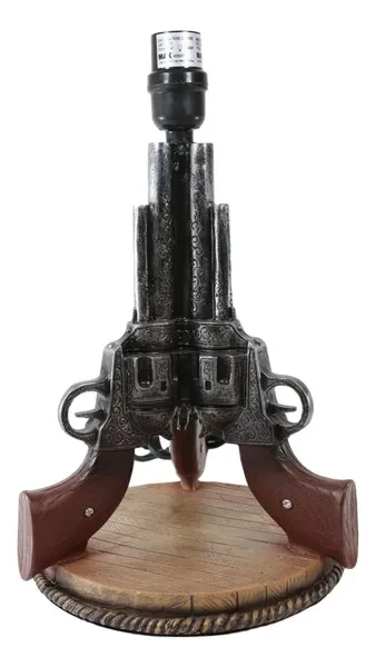 • This Western Triple Six Shooters Revolver Gun Table Lamp comes with the fabric shade as pictured. Made of polyresin, hand painted and polished, the quality finish is superb! • This overall Western Triple Six Shooters Revolver Gun Table Lamp measures about 20" tall. The shade is 8" tall and 13" in widest diameter. Fully assembled, the lamp weighs slightly over 4 lbs. • The 3 revolvers lamp body measures 14.5" tall and 9" in wide and 8.25" deep approximately. Because all our products are individually hand painted work of art, the color tone may vary from the pictures. Use only Type A light bulb (not included), Max 40 watt. Approx. 4 1/2 ft. UL Approved electric cord with a rocker on/off switch. • This western decoration is always a sensation for cowboys or lovers of the wild west. This decorative desktop or table lamp adds a well lit frontier touch to any room decorated with Western or Southwest themed home accents. Featuring well detailed 3 revolver guns pointing up toward the sky supported by a round faux wood plank base. This lamp will illuminate your room with Western Charm! • This is an Ebros exclusive collection. Accessories and Decor pieces in pictures are not included with the listing; only the shade and the revolver lamp base is sold in the this listing.