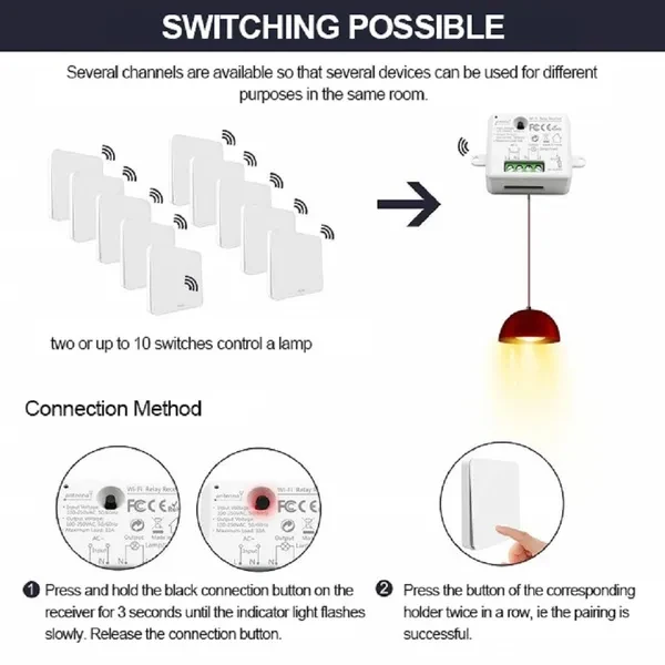 Specification Relay Receiver: Input/Output Voltage: 100-250VAC Max. Load: 10A Size: 47mm*46mm*23mm Wireless Switch(Remote) Power Type: Self-powered, No battery needed Work Type: Push Button Size: 86mm*86mm*15mm Features: Remote Control , no wire no extension cables required for the switch, can put it anywhere you need to control the light on off Please note , this item is without WiFi , only RF Self Powered Wireless Switch, No Battery, No Wires Required Long Control Range Indoor 30m , Outdoor 200m No Interference Reliable Wireless type, no intereference to each product , you can use many in the same space Multi switches control the same light How to Install the Receiver Connect the relay receiver between AC Power and light or other device Multi switches control the same light Tiny Size Relay Module Easy to Hide