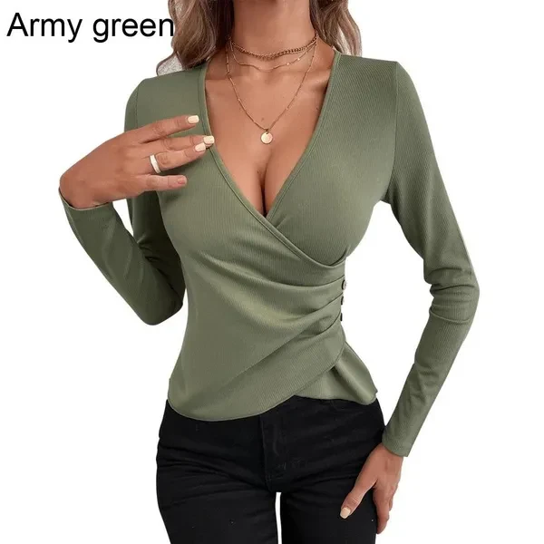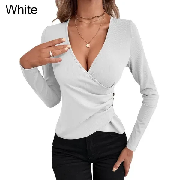 Women's Sexy Deep V Neck Long Sleeve Tops Ladies Low Cut Irregular Pleated T-shirt Fashion Slim Fit Tops