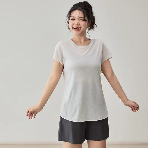 Fabric: 100% polyester Sleeve length: Short sleeves Gender: Women Pattern: Solid color Function: Quick-dry • Crafted with lightweight, breathable fabric to keep you cool and comfortable during summer workouts. • Quick-dry technology ensures you stay fresh and dry, even during intense training sessions. • Versatile design with an elegant beauty-back detail, suitable for yoga, Pilates, running, or general fitness activities. • Plus-size fit provides inclusive comfort for different body types, offering freedom of movement without restriction. • Stylish yet functional, this top transitions seamlessly from activewear to casual wear, making it a wardrobe essential.